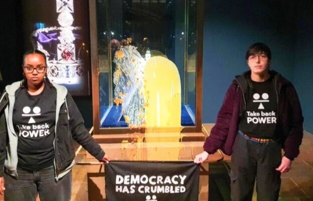 ঘটনার ভিডিও সামাজিকমাধ্যমে ছড়িয়ে পড়ার পর দেখা যায়—এক নারী প্রদর্শনী কেসে খাবারের ট্রে আঘাত করেন এবং সাথে থাকা এক যুবক কাস্টার্ড ছুড়ে মারেন। দুজনের শর্টে লেখা ছিল—“টেক ব্যাক পাওয়ার”। তারা স্লোগান দিচ্ছিলেন: “গণতন্ত্র ভেঙে পড়েছে”, “ব্রিটেন ভেঙে গেছে”।