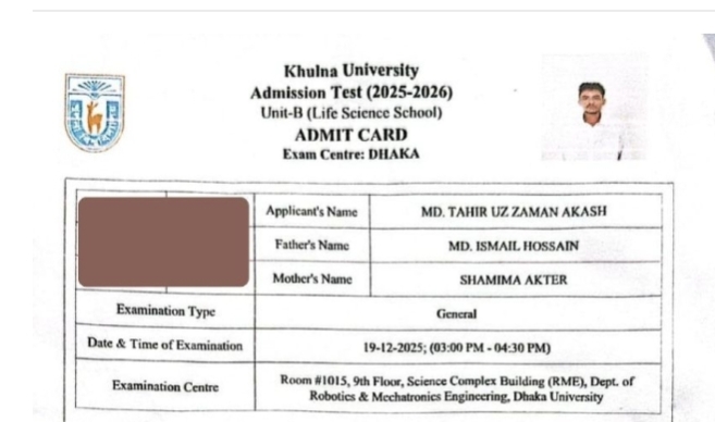 জানা গেছে, শুক্রবার বিকেল ৩টা থেকে ৪টা ৩০ মিনিট পর্যন্ত খুলনা বিশ্ববিদ্যালয়ের ‘বি’ ইউনিটের (লাইফ সায়েন্স স্কুল) ভর্তি পরীক্ষা অনুষ্ঠিত হয়। এই পরীক্ষা একযোগে খুলনা, ঢাকা, রাজশাহী ও চট্টগ্রাম—এই চারটি কেন্দ্রে আয়োজন করা হয়। মো. তাহেরুজ জামান আকাশ ঢাকা কেন্দ্র থেকেই পরীক্ষায় অংশ নেওয়ার কথা ছিল।